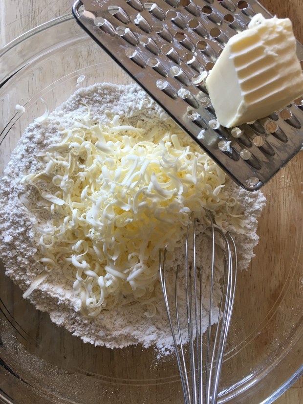 - Grate butter over the bowl. Do just a little at at time, stopping to mix it in so the grated pieces are separate and coated with flour, before adding more more.