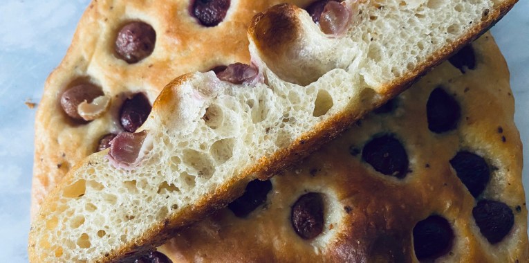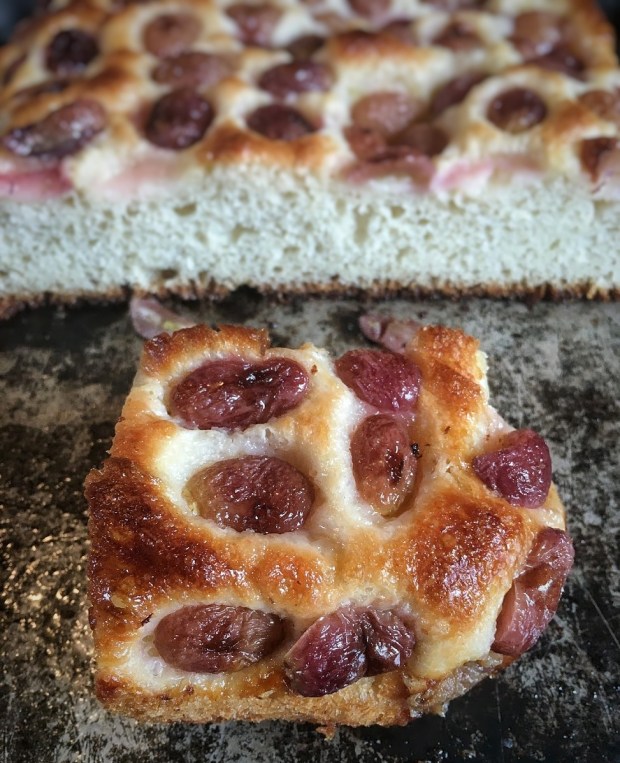 The videos below aren’t really instructional, and I didn’t understand a word, but they sure were fun to watch! One is from an Italian morning show cooking demo, and the other from a Italian bakery. I found recipes that fell into two categories: one was to make it pretty much the same way as focaccia, and the other was to roll out the dough into two portions, then layer the grapes in between the two sheets, so more like a pie, and both methods are represented in the two videos below. I also came across suggestions to use blueberries if you can’t find the wine grapes that are typically used, as they are more similar than the big red grapes pictured below.