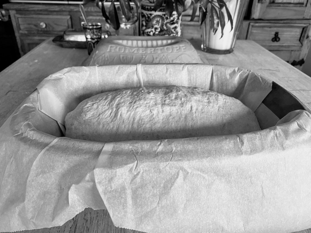 - Place in a clay baking container, (if using a Romertompf, follow instructions for soaking*) or any other heavy pot that has a lid that is lined with parchment paper.