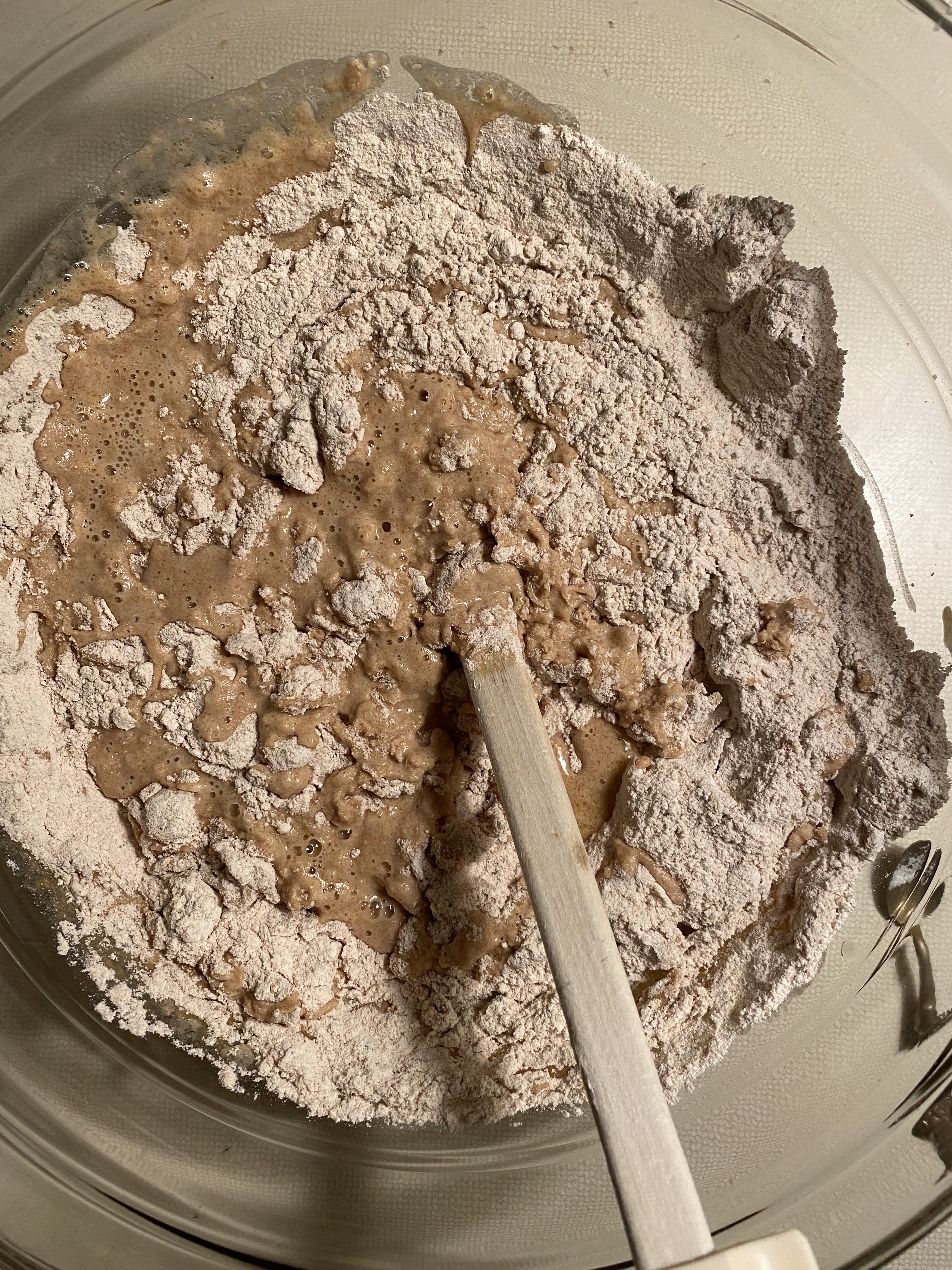 - Mix together with the handle of a wooden spoon, using wet bits of dough to scrape the dry bits off the sides. It’s a bit of a stiff dough, so kind of hard to mix.