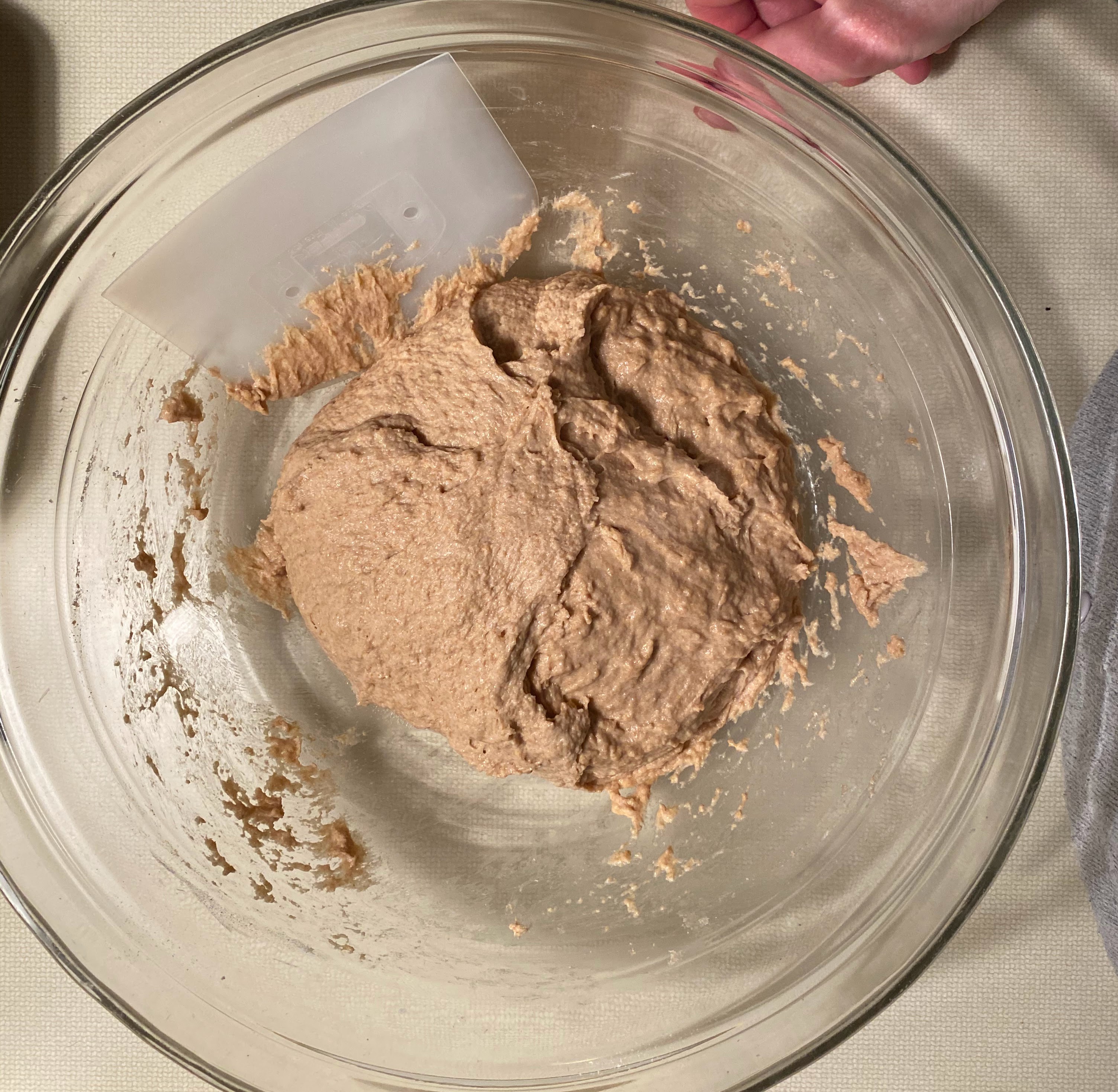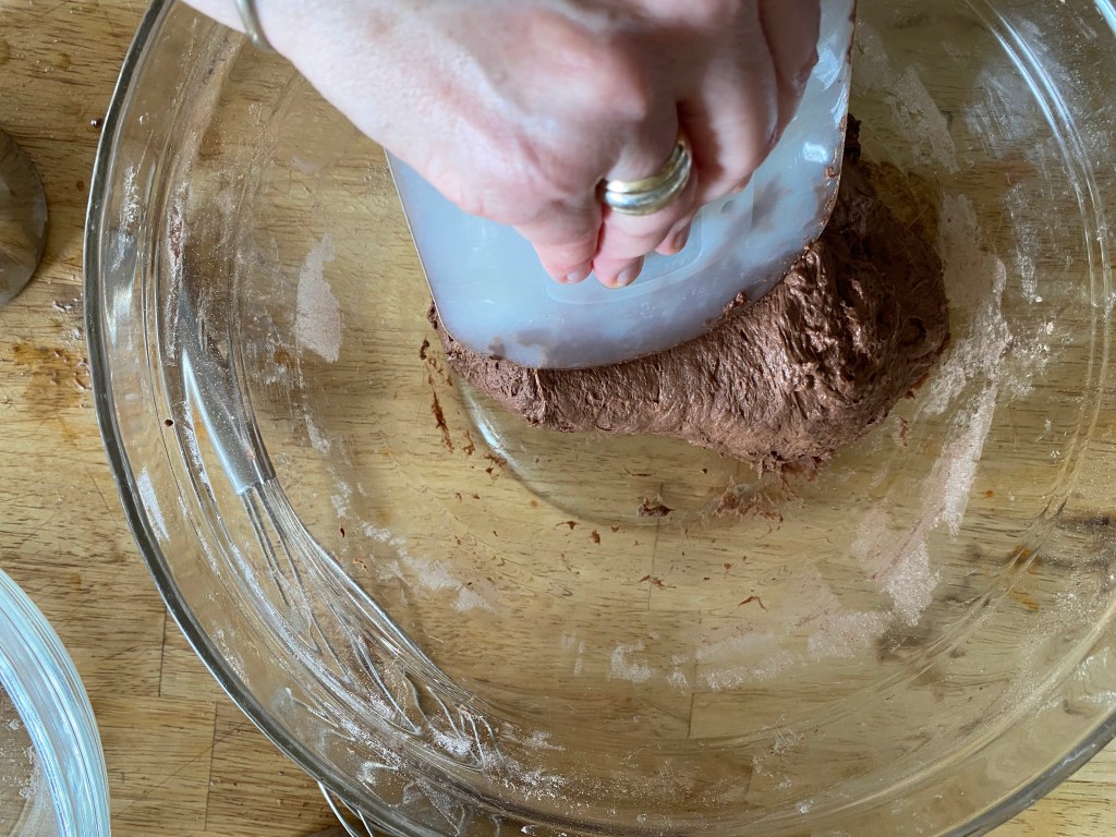 - Use your dough/bowl scraper to scrape down the sides of the bowl. Then, place the scraper under one edge of the dough, lift it up a bit and then fold it over itself, as you use your other hand to squish any dry spots to ensure they get incorporated.