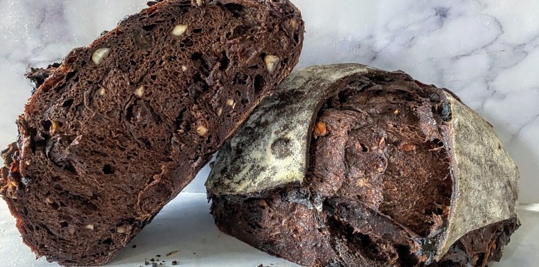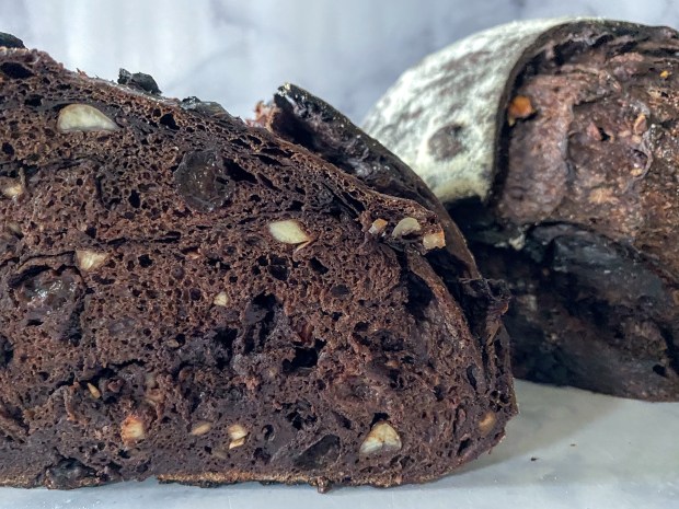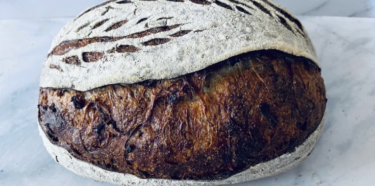 This decadent loaf is reminiscent of Cadbury’s popular Fruit & Nut chocolate bar. It’s got a soft, chewy crumb, a sturdy, crisp crust and is loaded with raisins, almonds and chocolate chips. I’ve adopted it from the Chocolate Sourdough Noir I found on Emilie Raffa’s website, The Clever Carrot. The website and her book, Artisan Sourdough Made Simple, are highly recommended for anyone with even just a passing interest in sourdough.