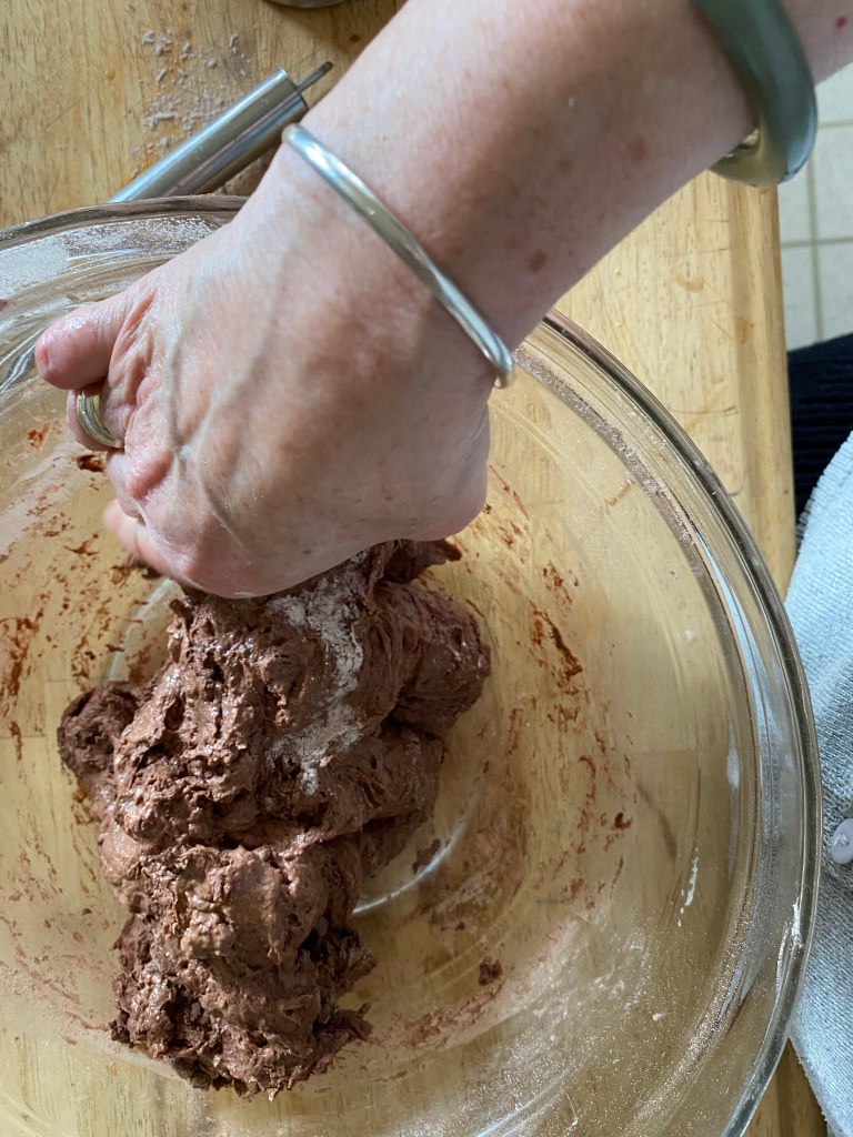 - After the dough has rested an hour, fold in the raisin/nut/chocolate mixture.