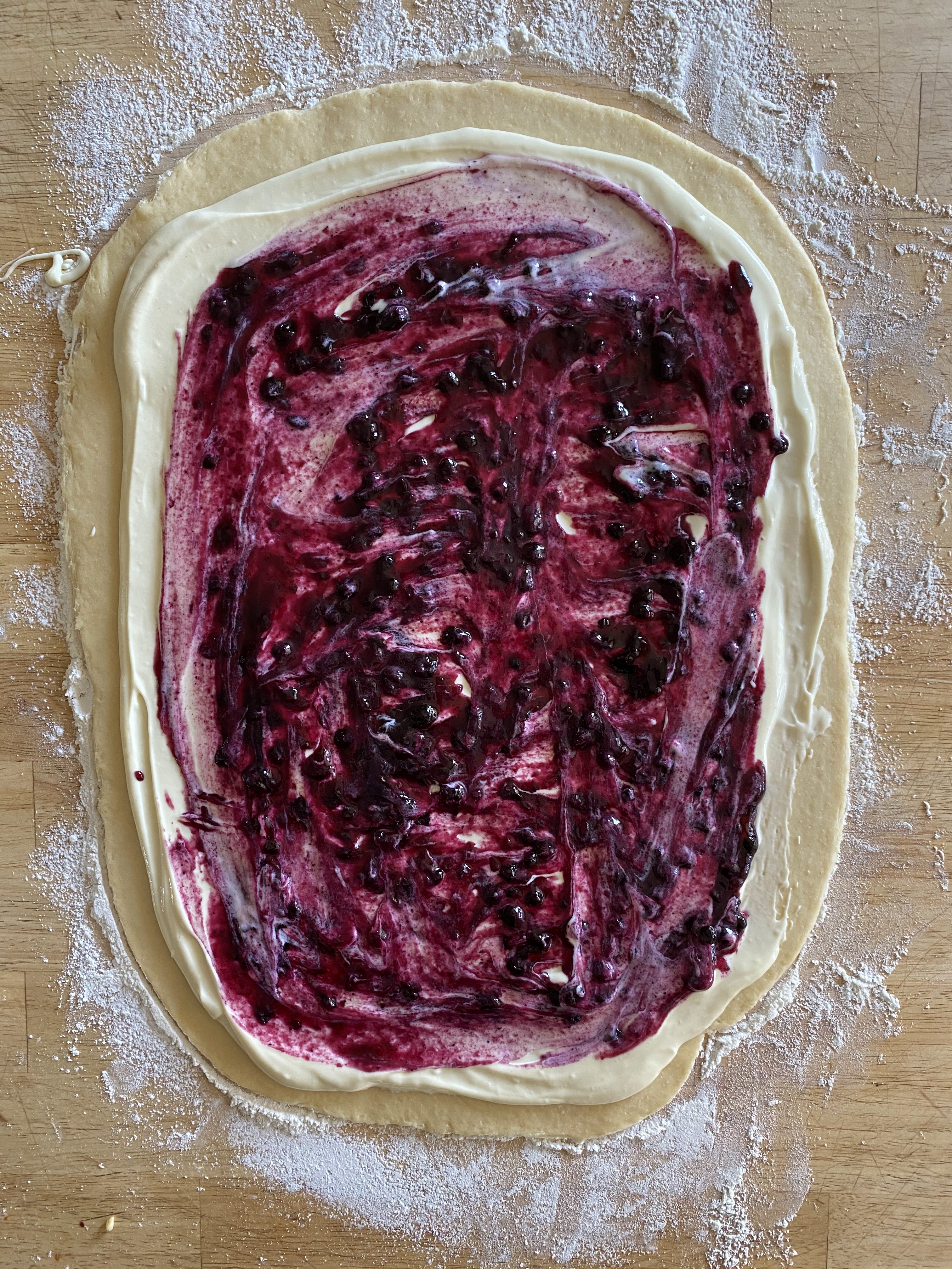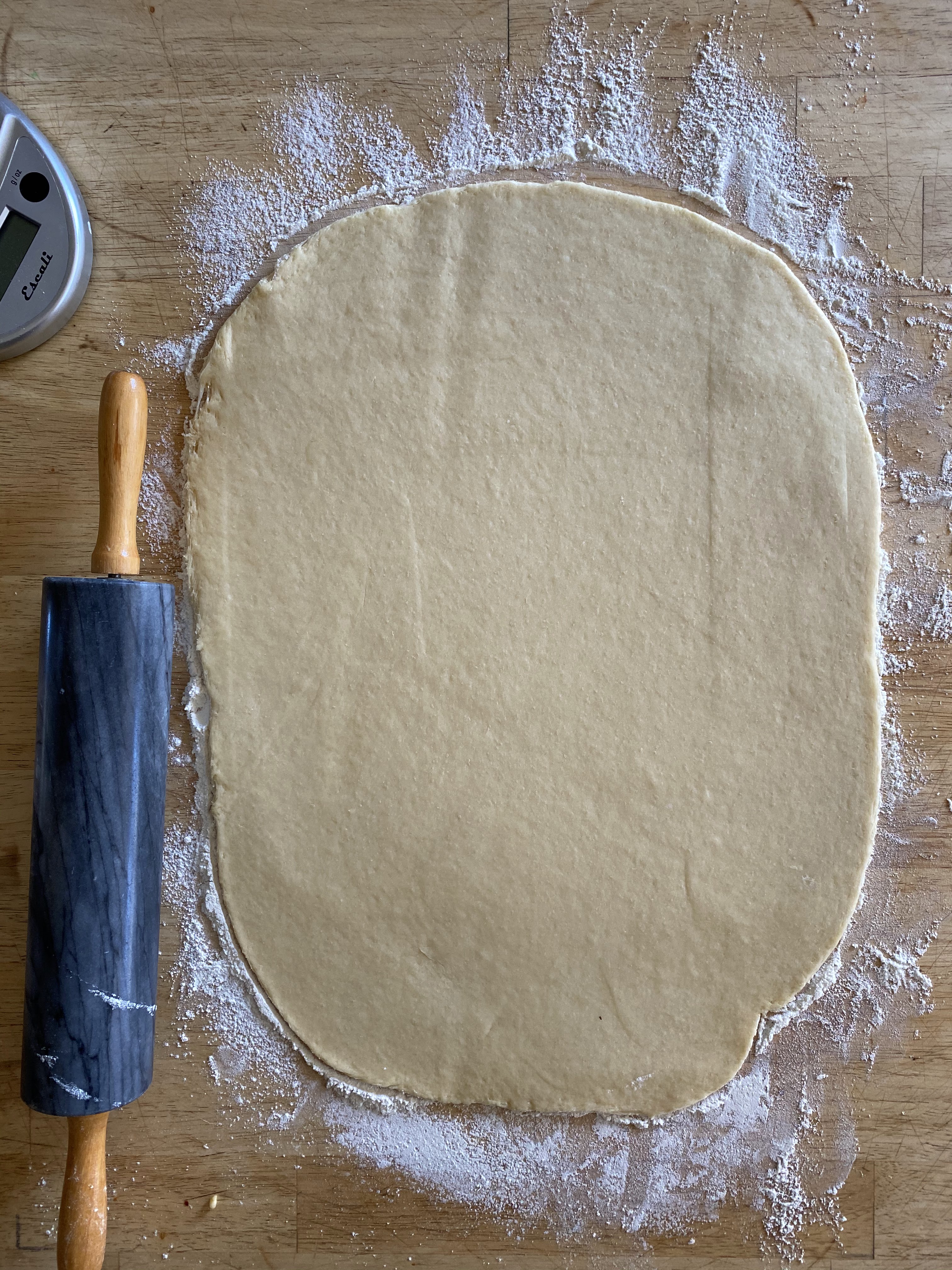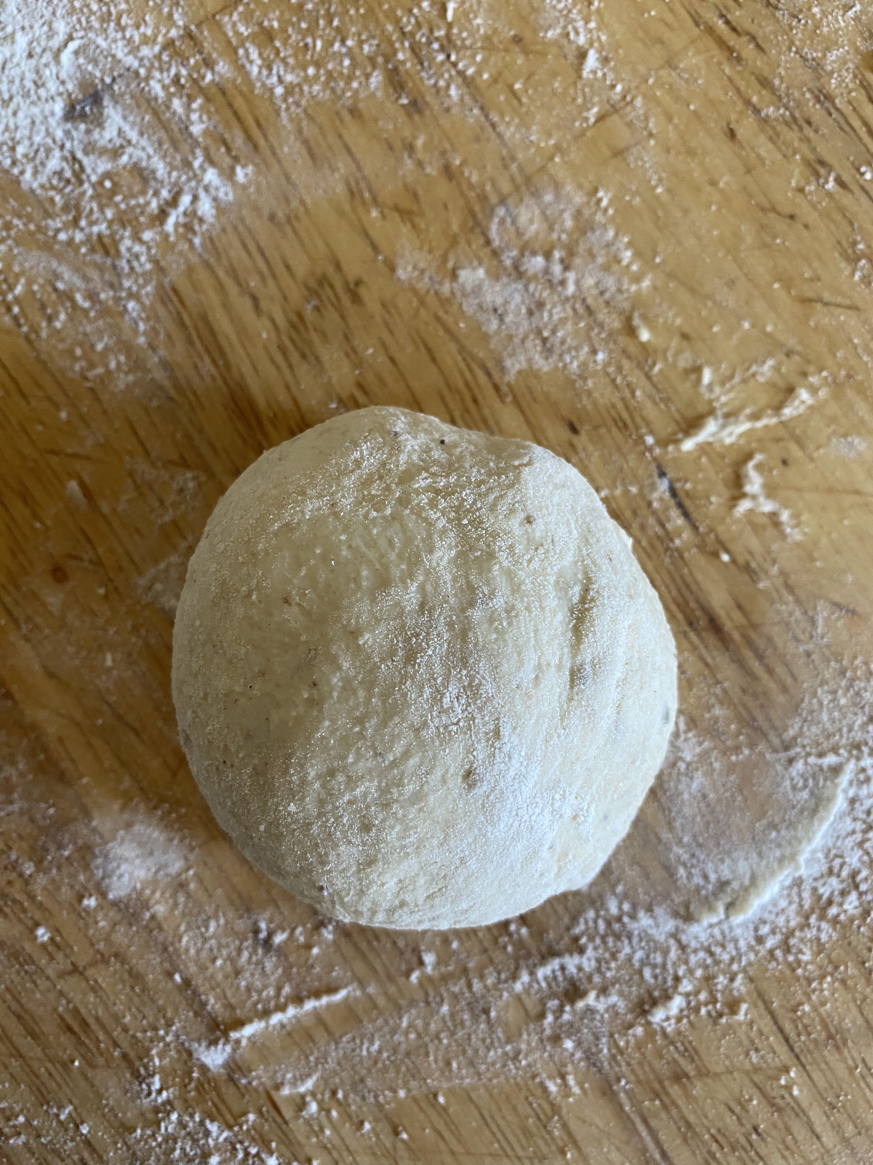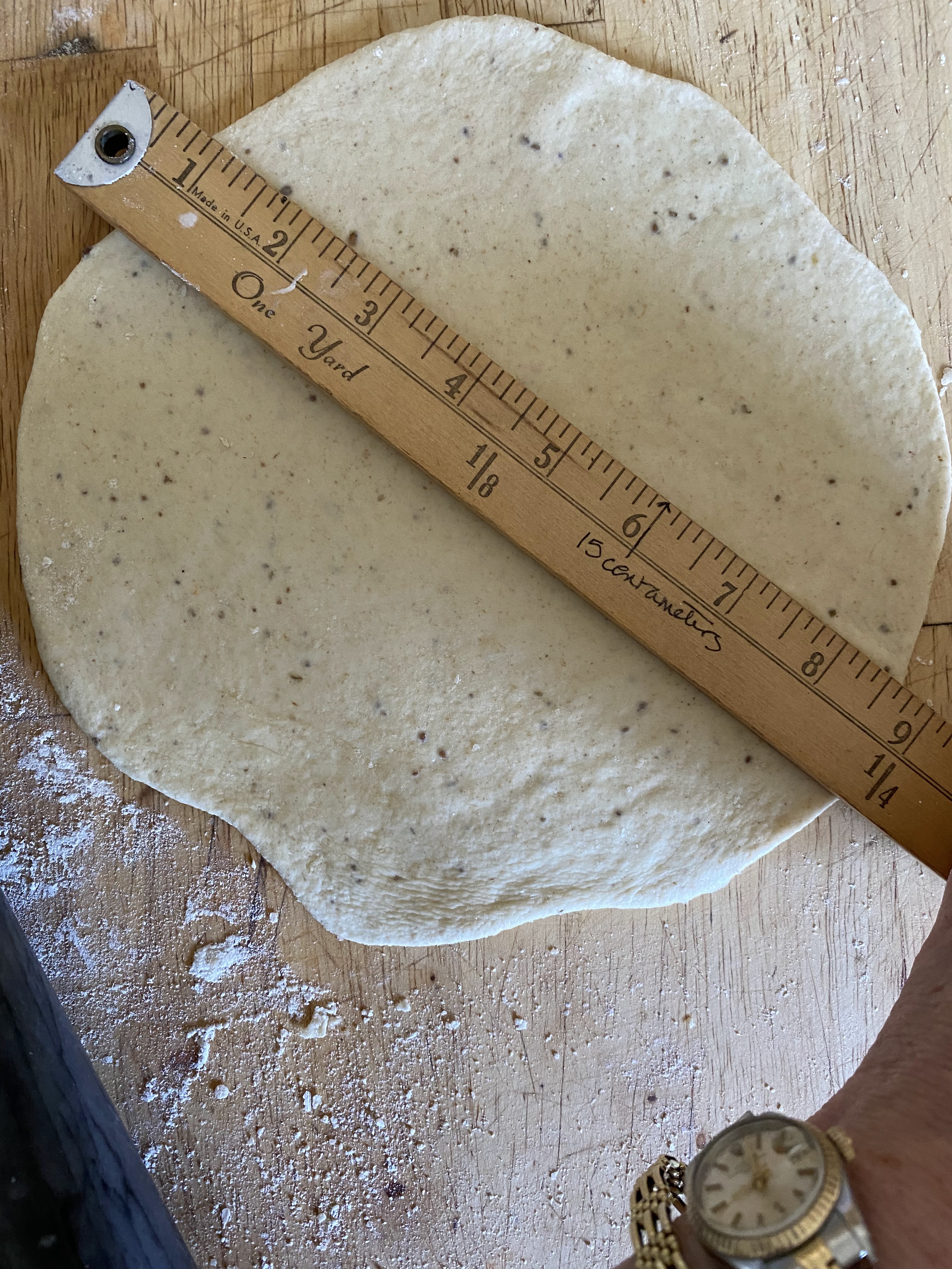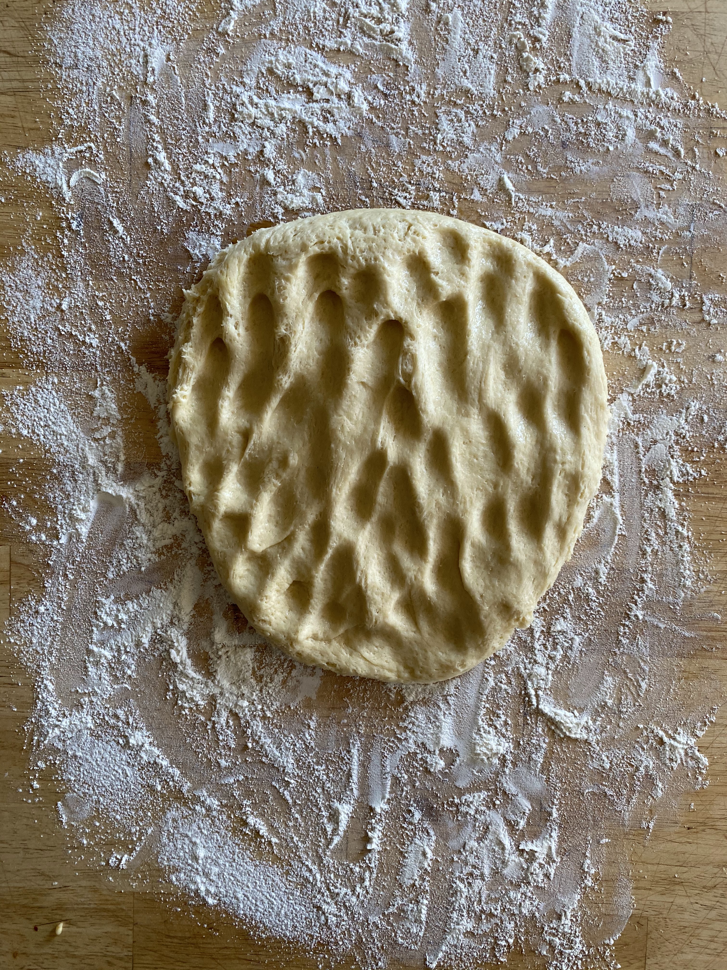 - Flatten the larger ball and roll out to an 9″ disc. Dust with flour if necessary if it is sticking to the countertop.
