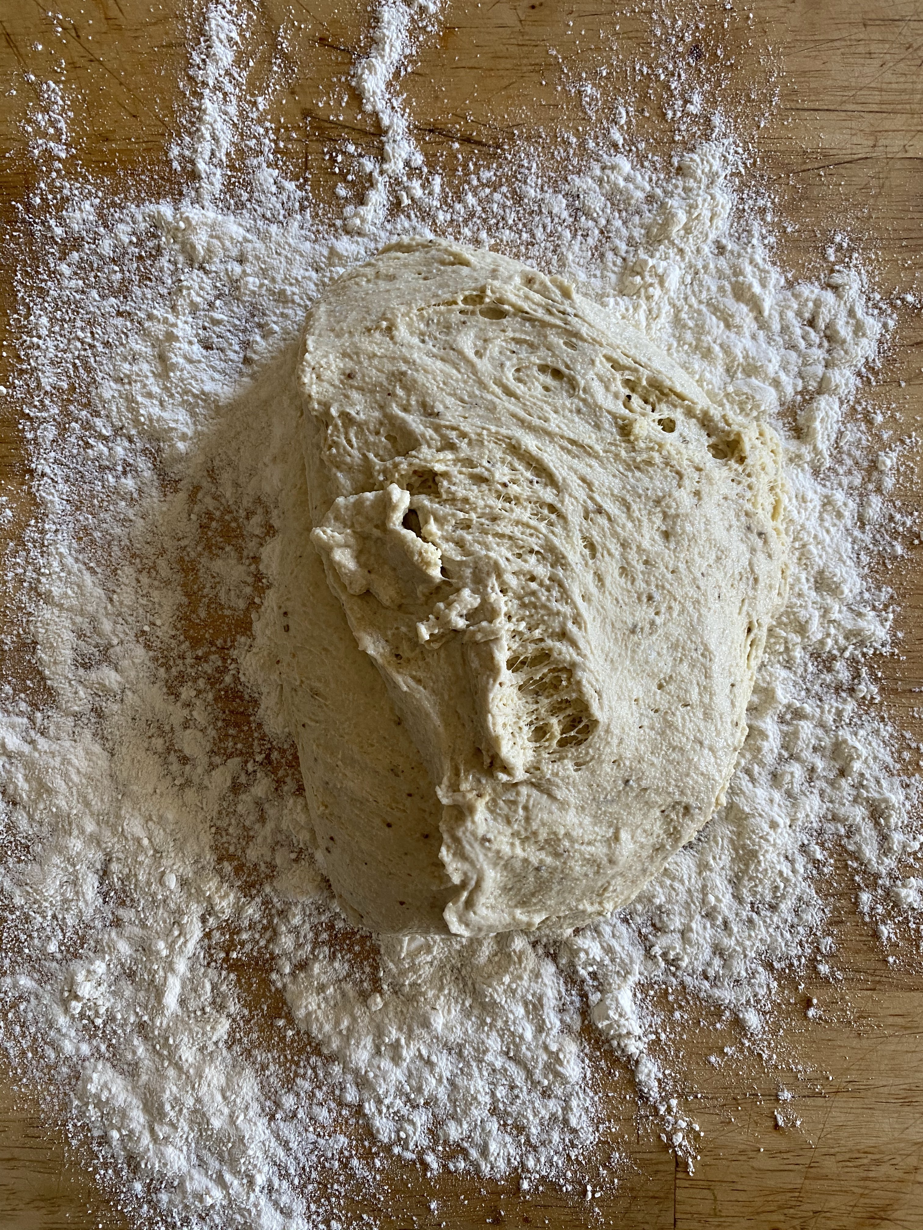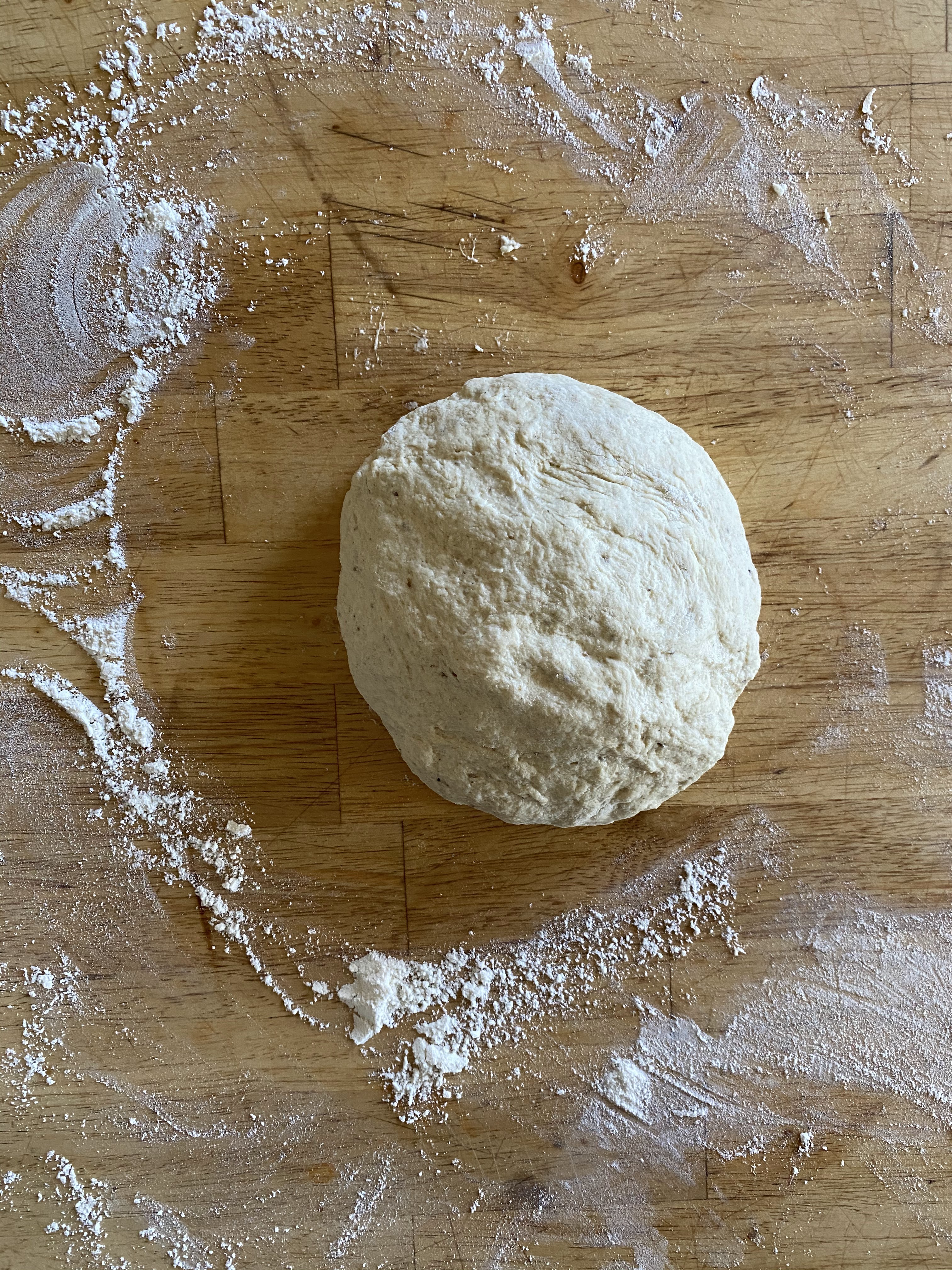 - Knead to incorporate flour into the dough so that it’s not as sticky and easier to work with, using a bench scraper if it starts sticking to the counter.