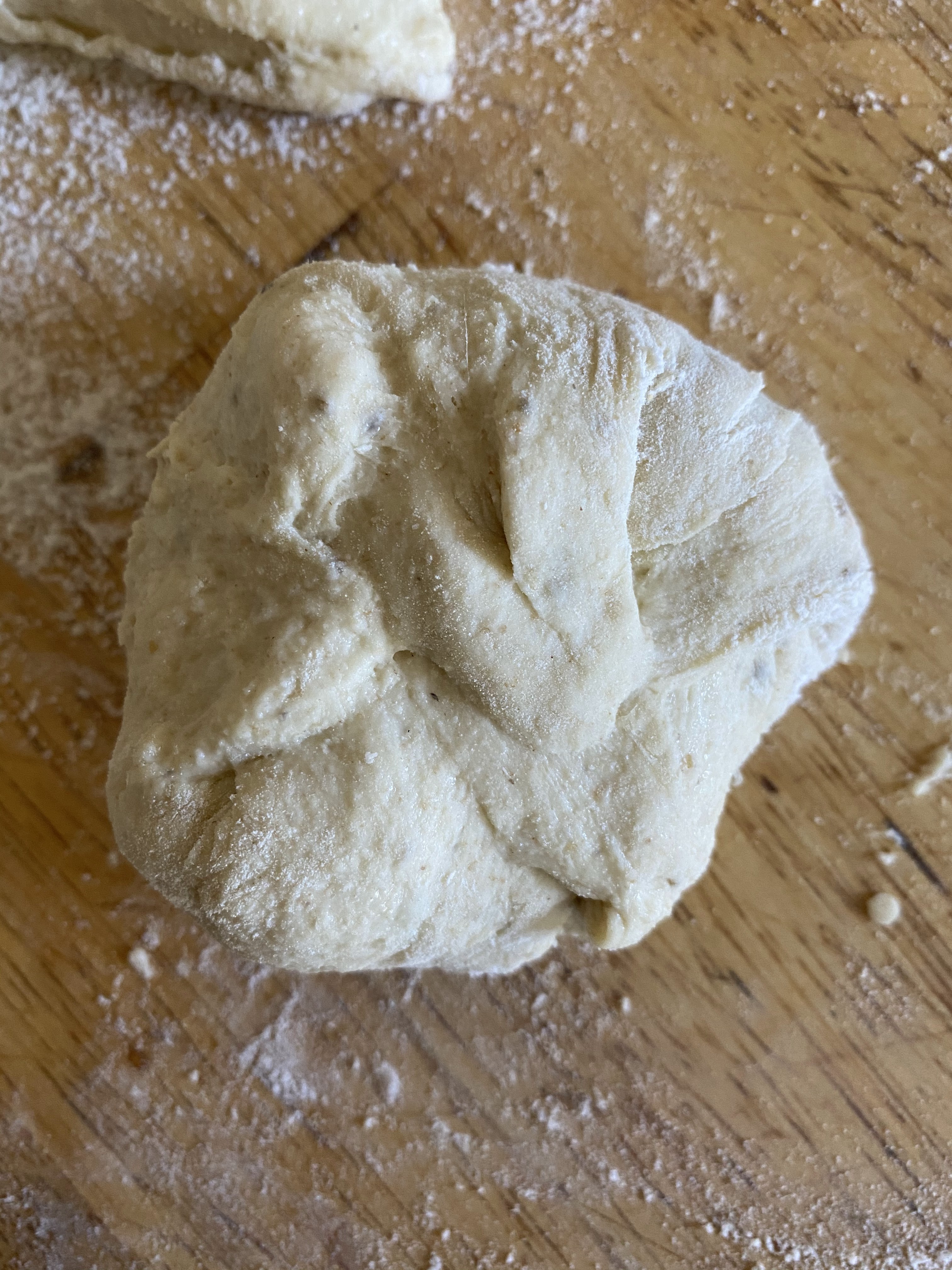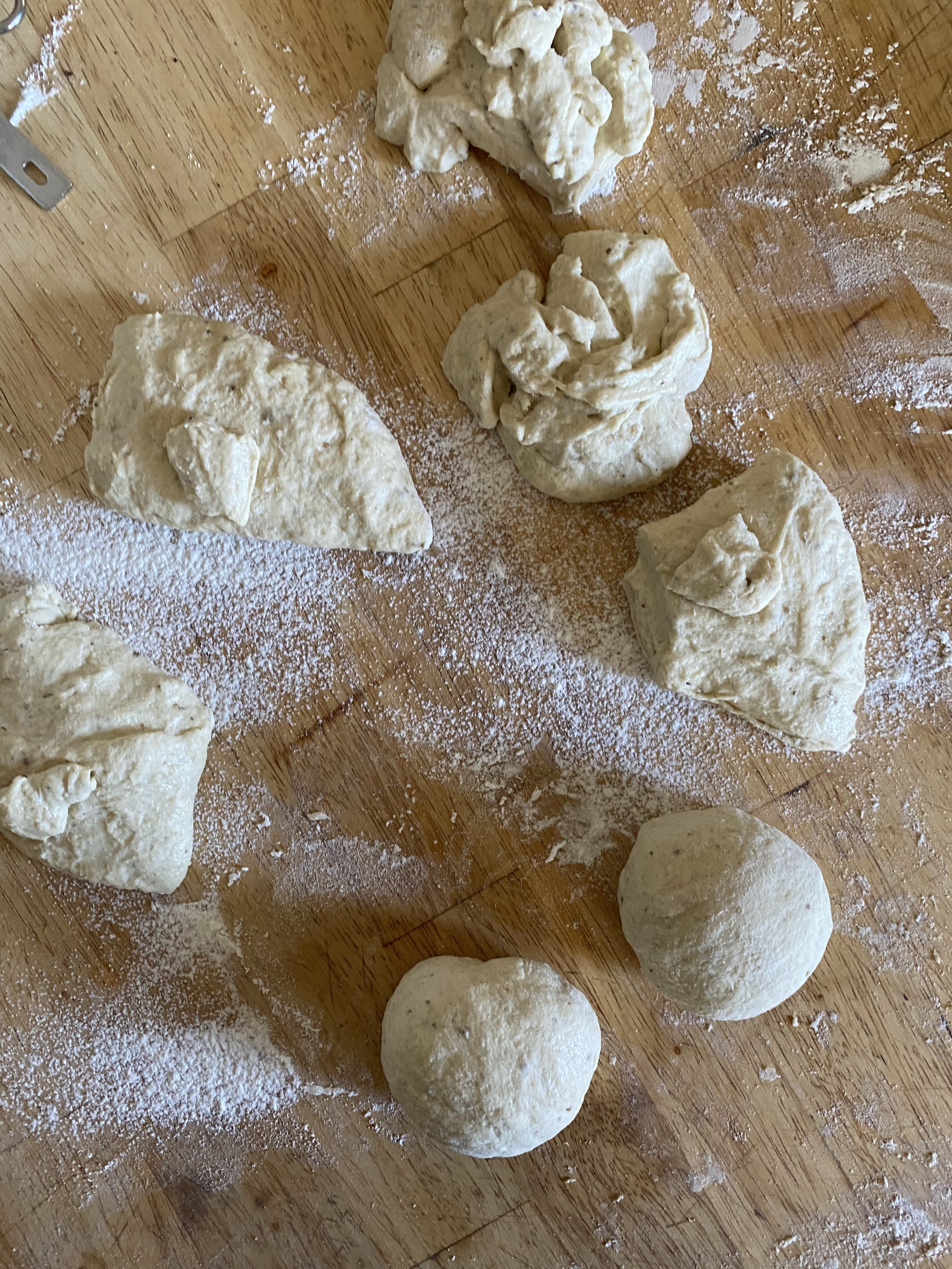- Seperate dough into into seven pieces, six weighing 110g and one a bit larger, weighing 124. (Total weight should be around 784g.)