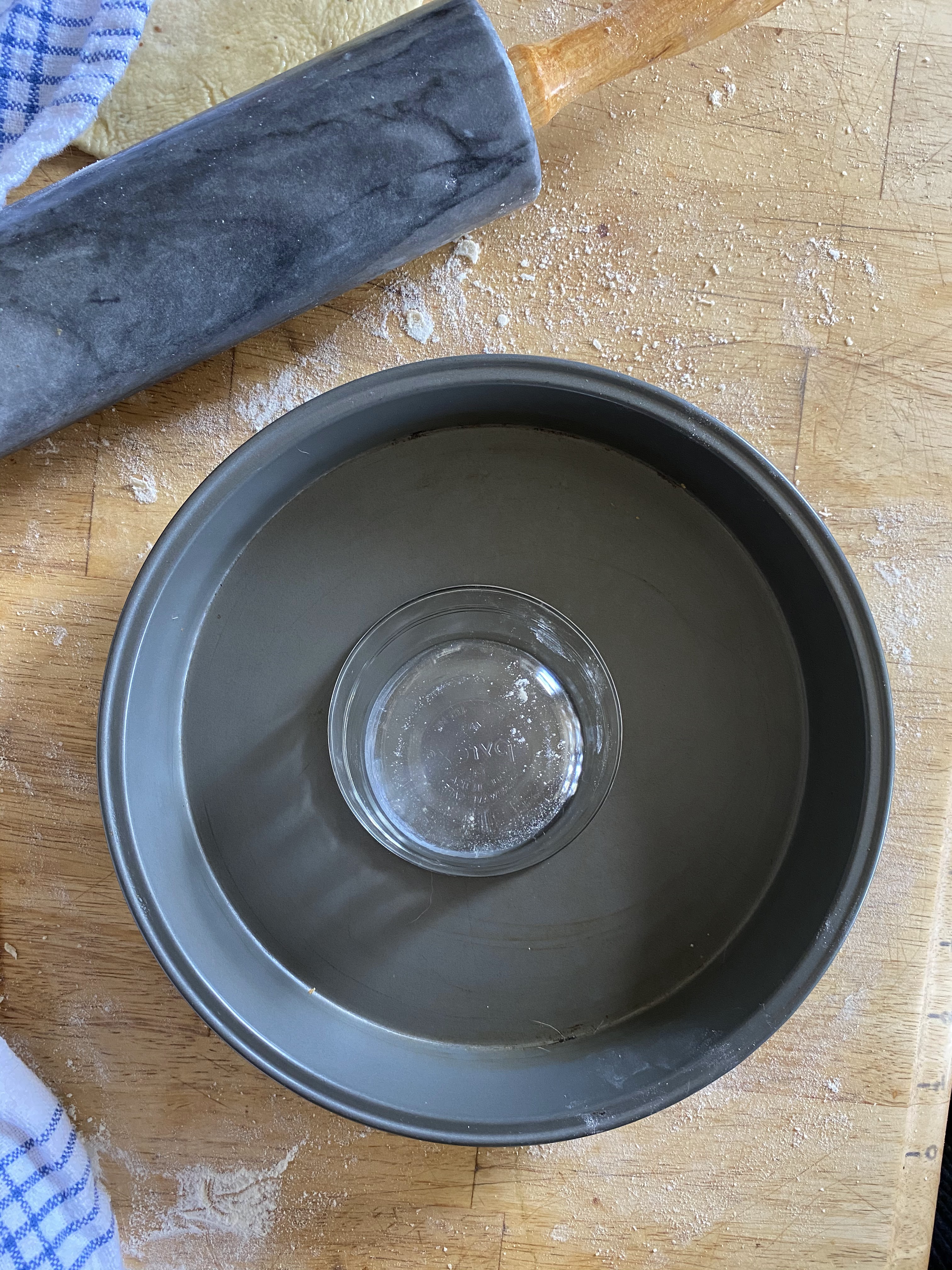 - Place a heat proof glass bowl/small ramekin in the center of the cake pan.