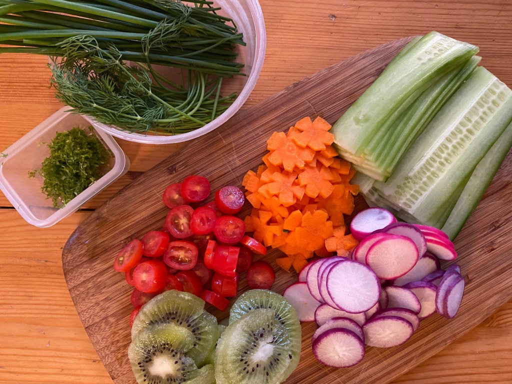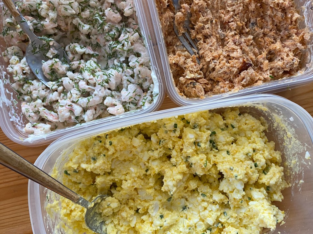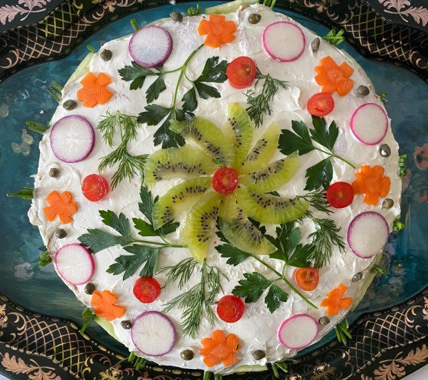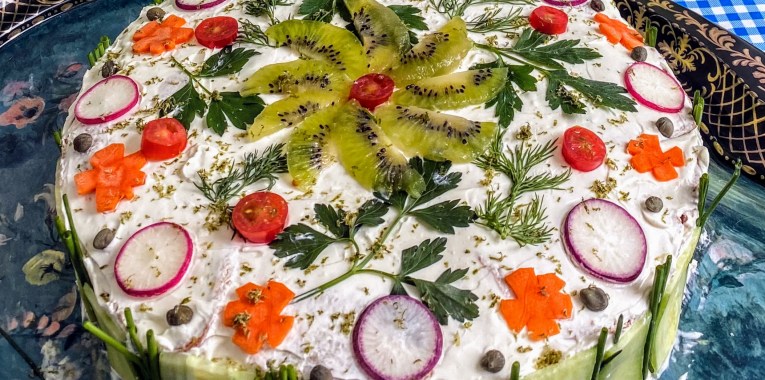 Smörgåstårta is a savory bread-layered cake, and you can use any fillings you like (we prefer egg salad, smoked salmon spread, and bay shrimp mixed with sour cream and fresh dill), cover it with a cream cheese/sour cream mixture and then decorate with fruits, vegetables and/or herbs.