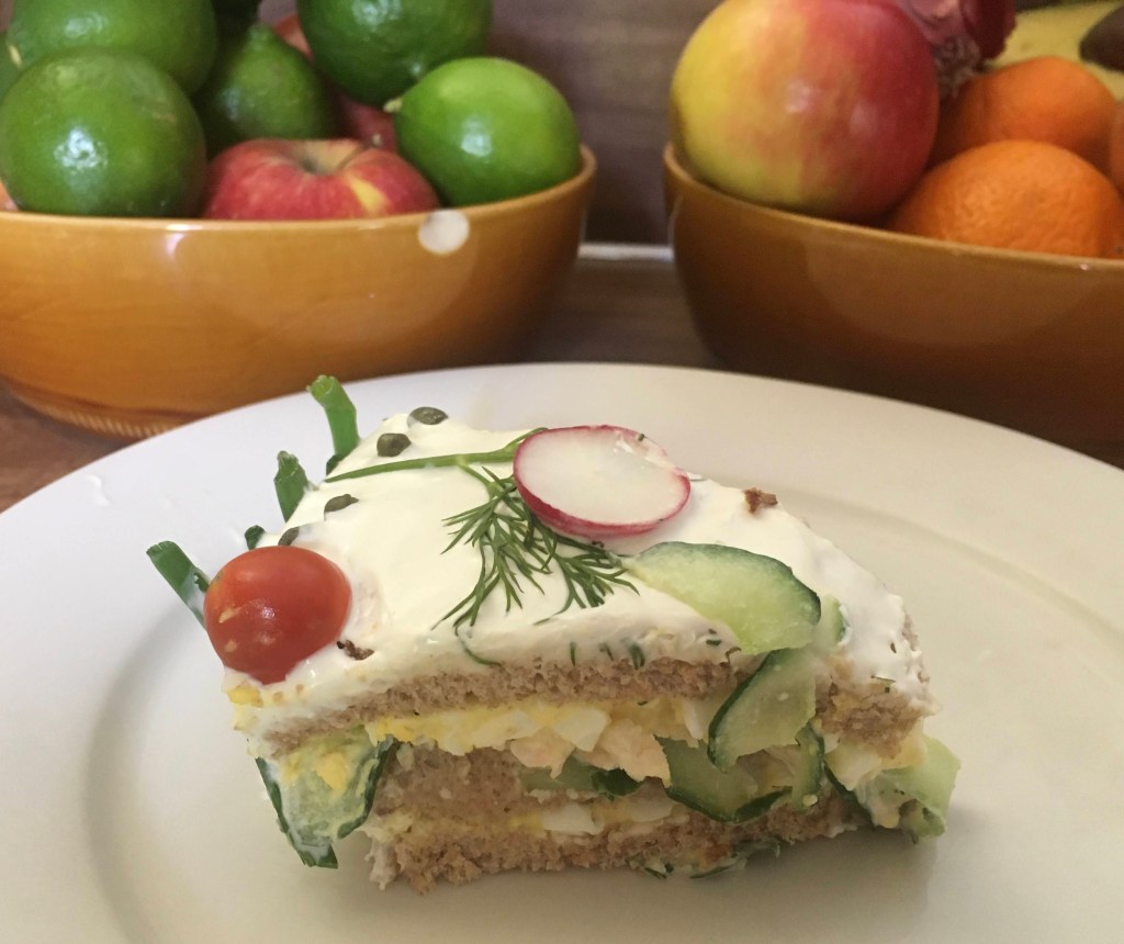 This Swedish sandwich “cake” is a wonderful party dish in the Spring; perfect for Easter or Mother’s Day. It’s made with bread instead of cake, filled with a variety of savory spreads, iced with cream cheese, and decorated with fresh herbs and vegetables. You can make it ahead of time, and then finish off the outside on the day you’re going to serve it. Fillings and toppings are varied, and can be seafood and/or meats, or vegetarian. And, best of all, it’s super easy to make (although a little time consuming).