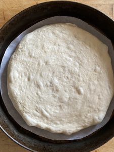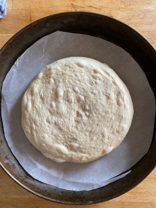 This version is adapted form the muffaletta recipe on the King Arthur Baking website. I used the ingredients exactly as listed, and it produces a superb loaf. But my method is a little different, so I’ve written out instructions below. And be forwarned: timing is a factor, and it’s important to figure out what schedule you’re going to follow before you begin. You can start in the evening, before you go to bed, or first thing in the morning. Also, you need a 14″ pizza pan to bake the bread.
