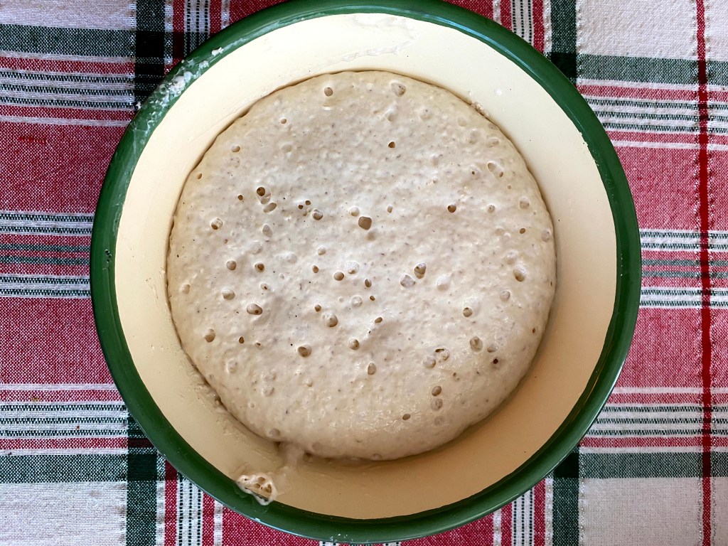 - Cover and let sit at room temperature for about 60 ~ 90 minutes, so it’s bubbley, and has risen a bit, but not so long that it started to collapse.