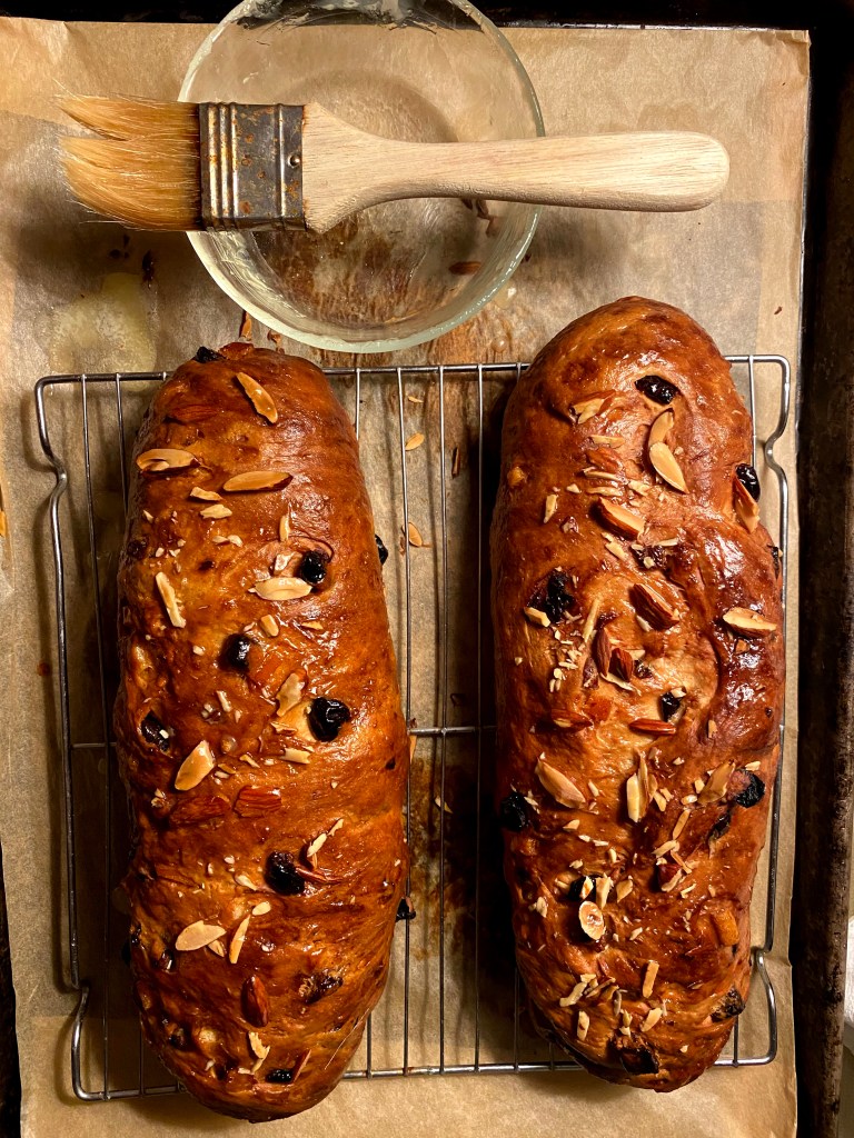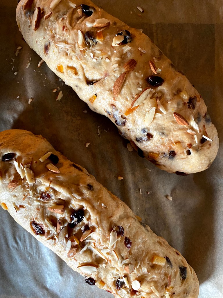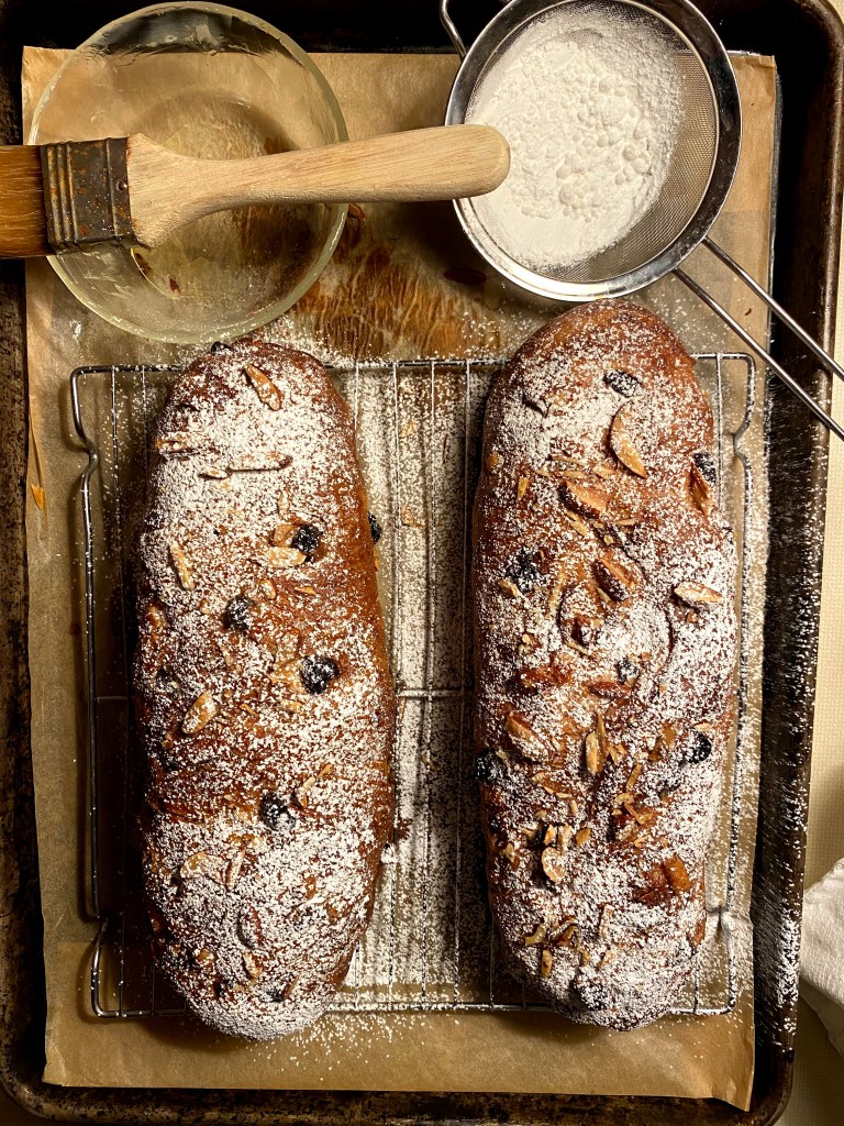 - Put powdered sugar in a sieve, and then shake over the top of the stollens to coat. Wait a minute, then repeat. You want alot, more than what you’d typically use.