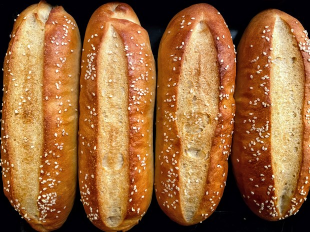 - Turn dough out onto oiled counter and divide into 10 pieces or 12 pieces. Cover pieces so they don’t dry out.