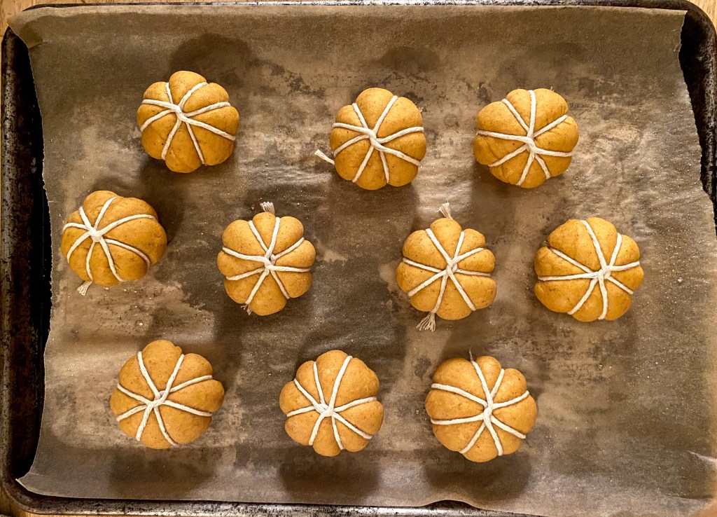 - Wrap string to make pumpkin shaped indents, then place on a baking sheet lined with parchment paper. Cover those too, as you make the other ones.