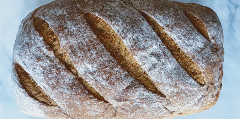 - 480g whole wheat flour (shake through a fine sieve, then save the germ to dust on top of bread before scoring)