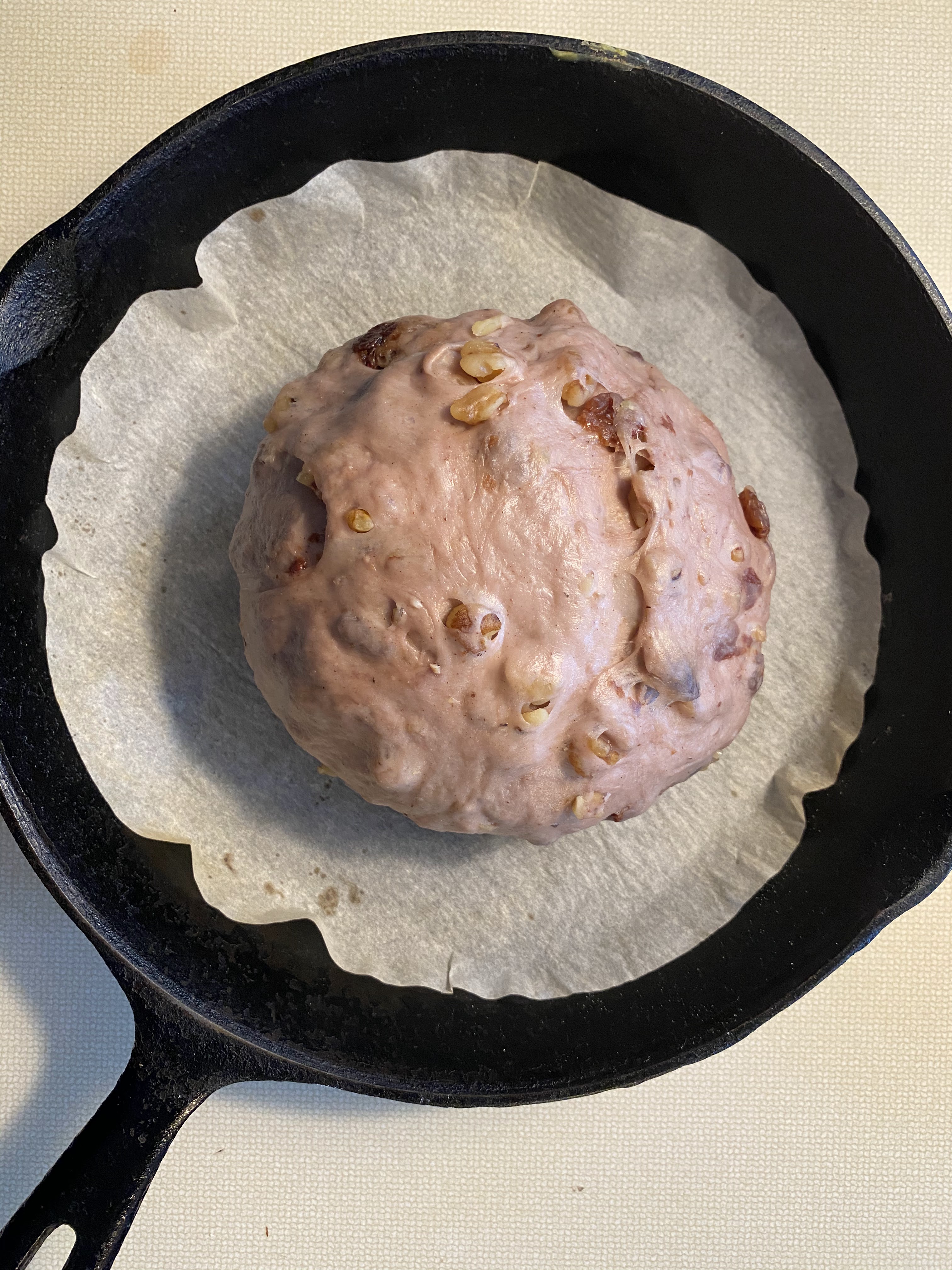 Next day, remove dough from bowl and do some stretch & fold kneading. It’s a tight dough, so it won’t stretch a whole lot.